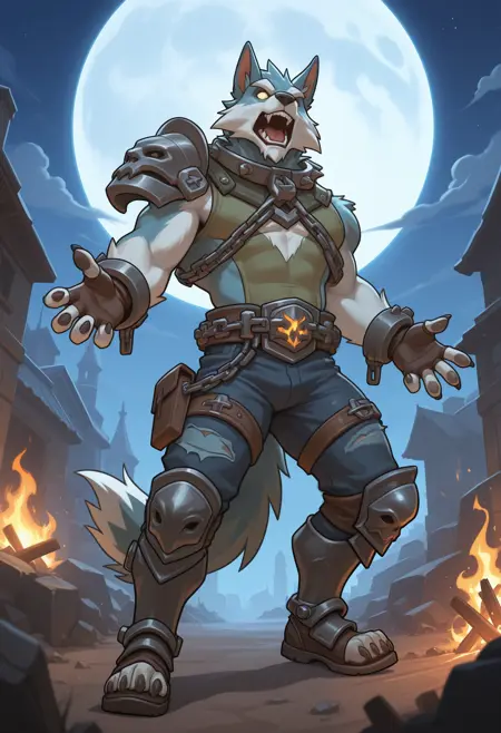 주요 옷차림: 스틸 칼라, 스틸 가슴 하네스, 체인 벨트, 갈색 핑거레스 장갑, 금속 손목 커프스, 무릎 보호대, 스틸 다리 갑옷, 찢긴 바지, 단일 파울드론, 찢긴 녹색 셔츠, 손상된 신발,
