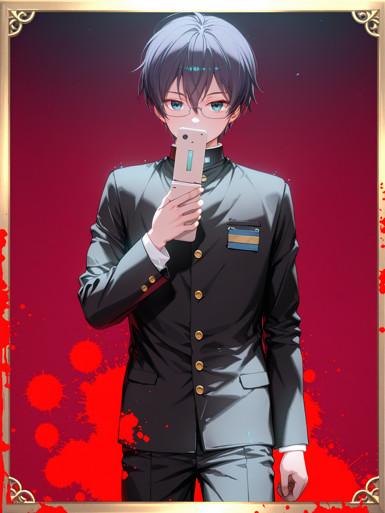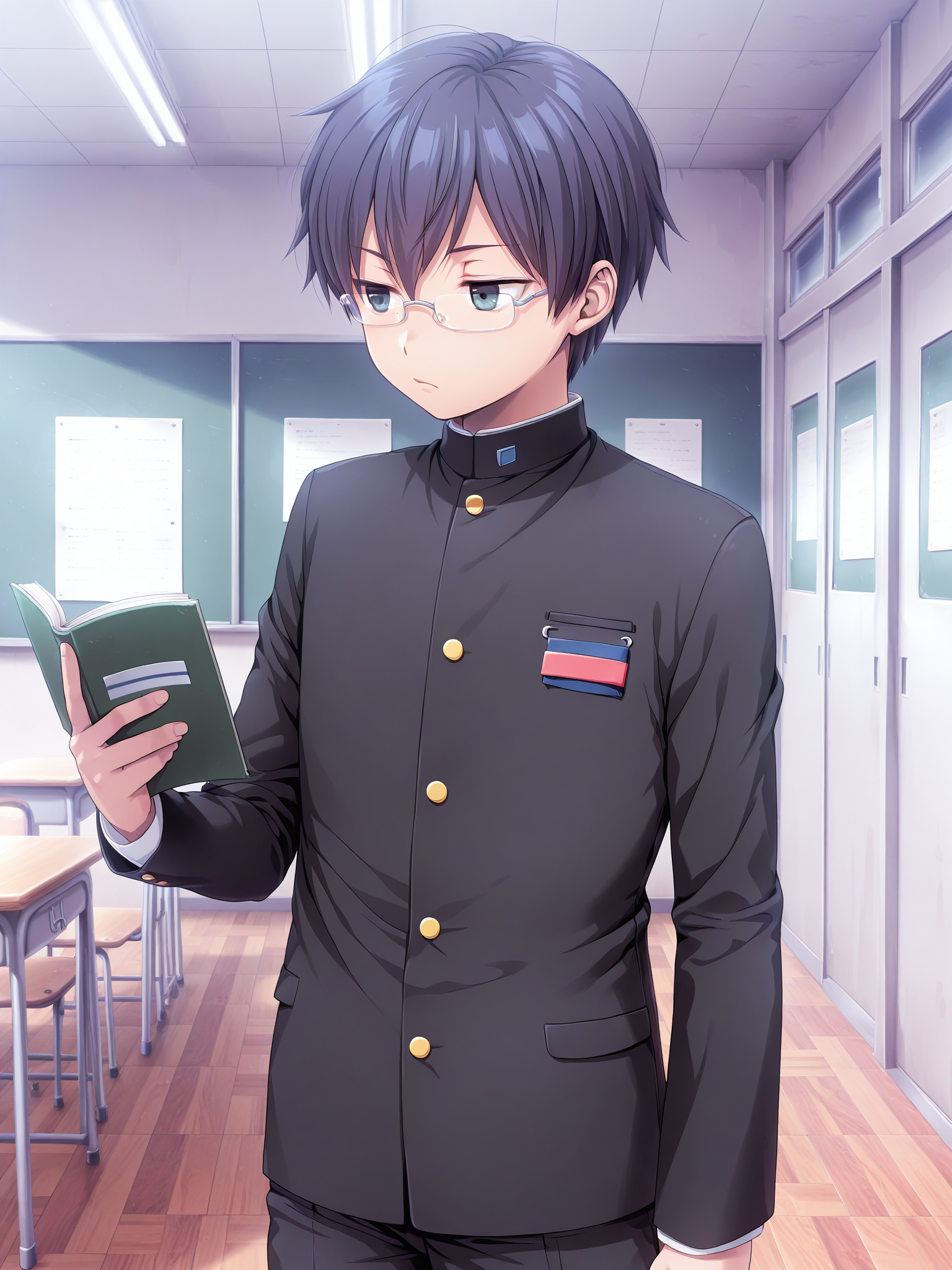 school uniform, gakuran, unbuttoned, badge, black pants, uwabaki