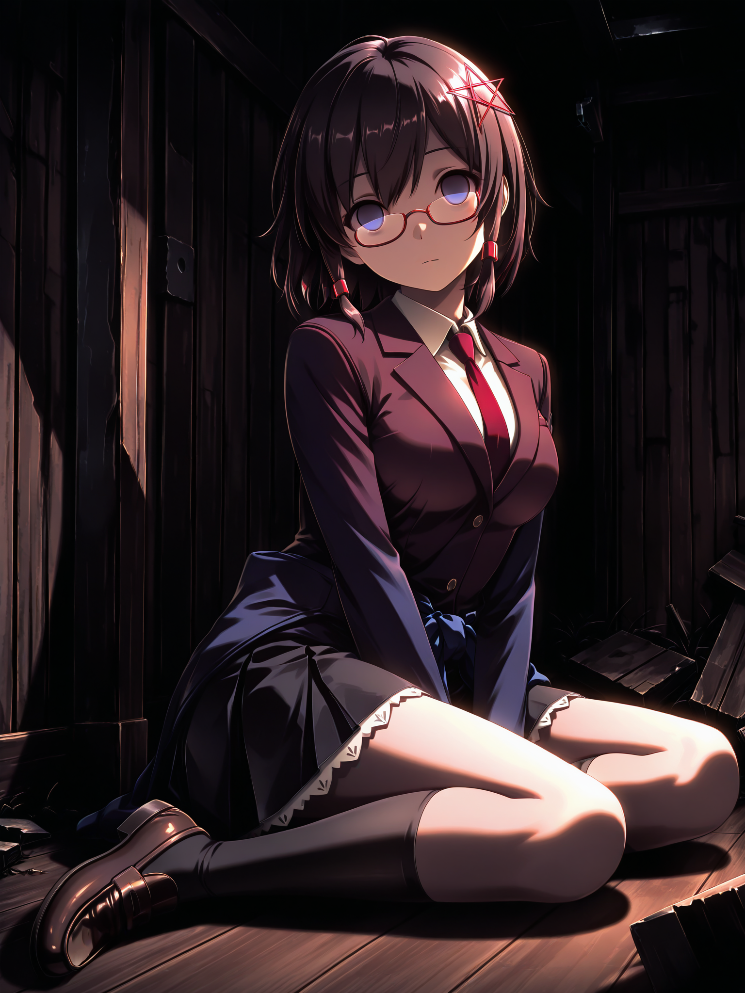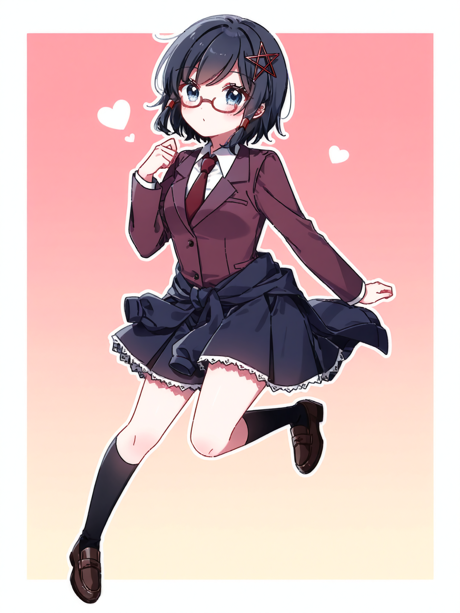 Naho_CoPa, 1girl, short hair, pentagram hair ornament, red glasses, hair tubes, medium breasts