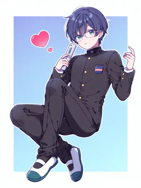 school uniform, gakuran, unbuttoned, badge, black pants, uwabaki
