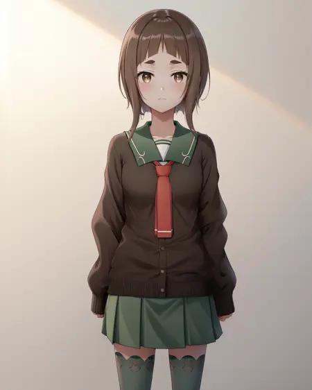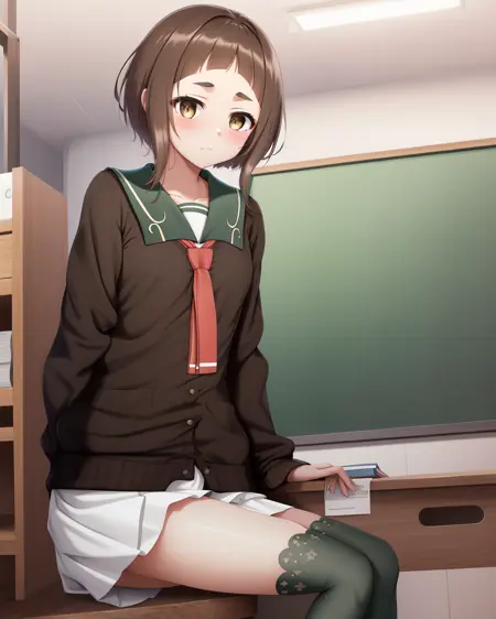 1girl, solo, brown hair, brown eyes, short hair, school uniform,skirt,necktie, green thighhighs, cardigan,