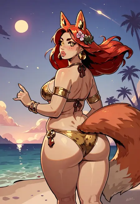| 训练词汇 | c1rc3,1girl,red hair, brown fur, golden eyes, kemonomimi, fox ears, large tail,已复制! chubby, curvy, thick thighs, wide hips, cleavage, full lips, 已复制! strapless outfit, fur clothing, spotted fur, moon motif, red hood, big hat, fur trim, sleeveless, bare arms, gold jewelry, earrings, armband, bracelet, multiple gemstones, belt pouches, 已复制! |
