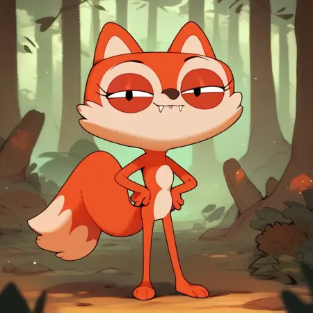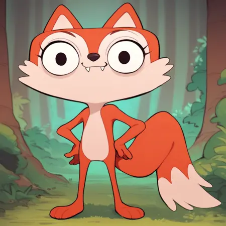 foxgirl, red and white fur, black eyes, black nose, fangs, fox tail,