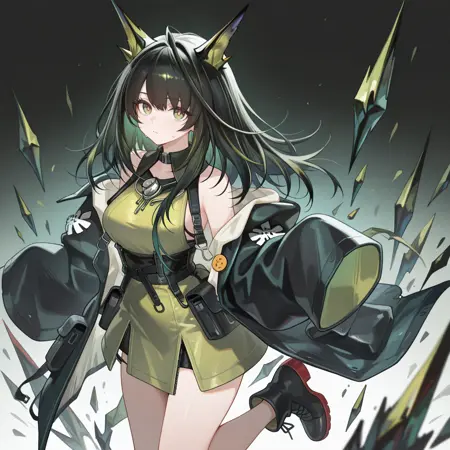 服装:黑色外套,袖子过手指,绿色无袖连衣裙,单侧大腿绑带,靴子,
