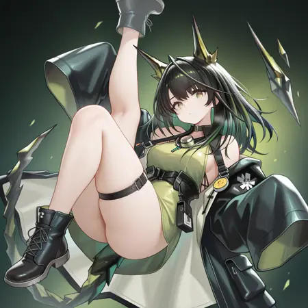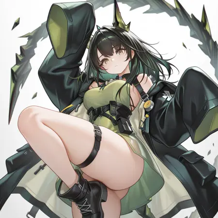 衣装:黒コート、指先より長い袖、無袖の緑色のドレス、片側太ももストラップ、ブーツ、