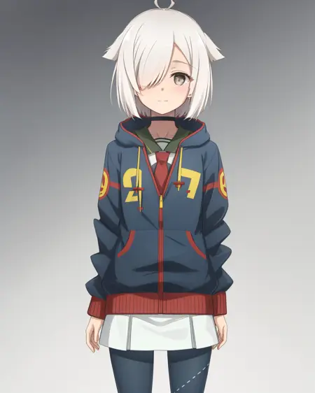1girl, solo, white hair, gold eyes,ahoge, short hair, hair over one eye, blue pantyhose,skirt, hair flaps, hoodie, blue jacket,