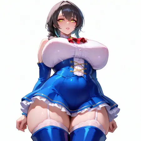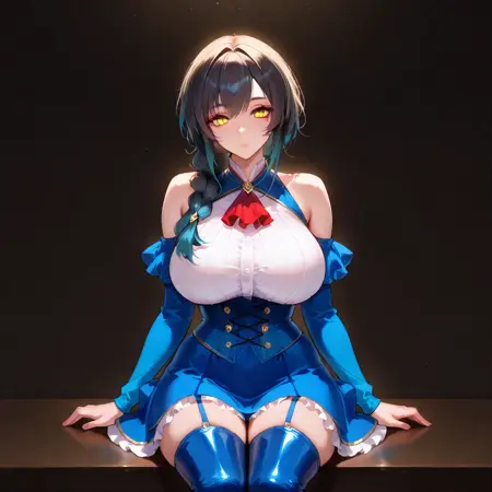 bare_shoulders,dress,white_shirt,blue_skirt,detached_sleeves,blue_sleeves,red_ascot,frilled_skirt,blue_corset,lace-trimmed_corset,white_thighhighs,garter_strap,thigh_boots,high_heel_boots,blue_footwear,