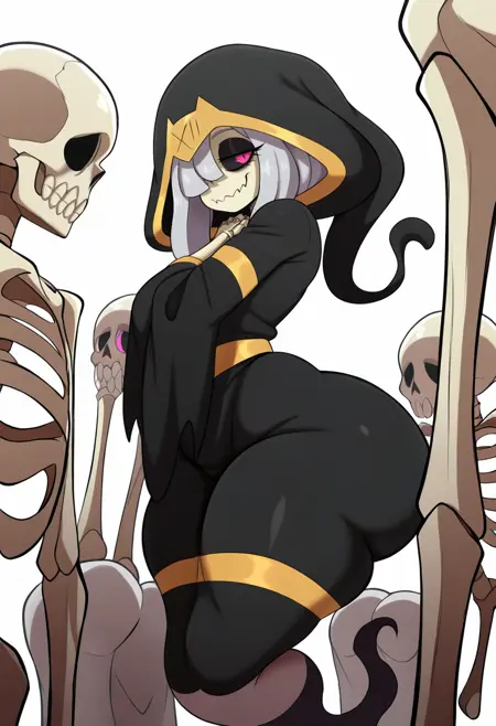 DeathIL,1girl,red eyes,grey hair,thighs,hood,pink eyes,hair over one eye,hood up,colored sclera,wide hips,skull,ghost,black sclera,skeleton,bone,ghost tail,no feet,dress