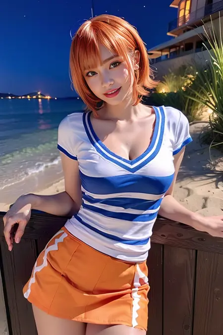 トリガー語:namiv1, brown eyes, miniskirt, striped shirt, skirt pattern, short sleeves, short hair, orange hair,