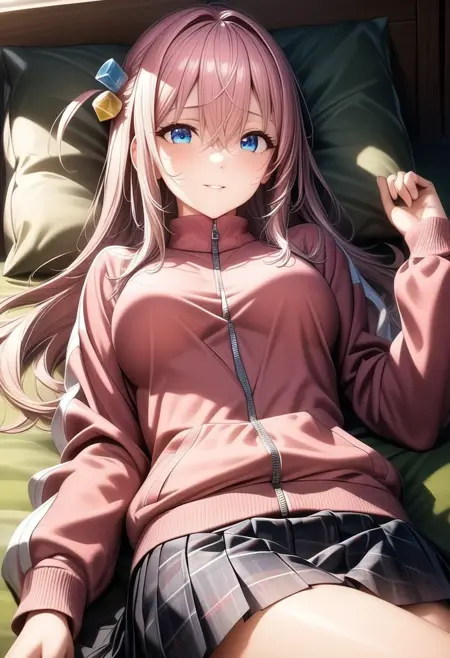 触发词:hitori_a_xl, gotou hitori, 粉色头发,长发,刘海,蓝眼睛,头发遮住眼睛,发饰,立方体发饰,粉色夹克,运动夹克,长袖,裙子,百褶裙,