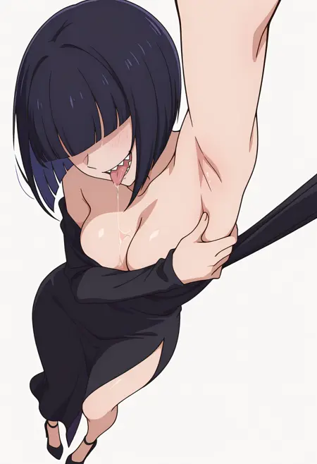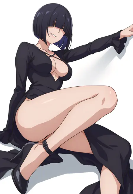 黑色连衣裙,侧开叉,长袖,不穿内衣,高跟鞋,