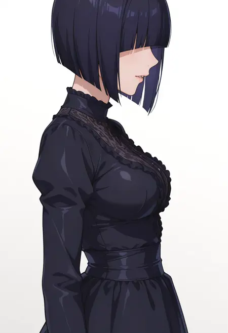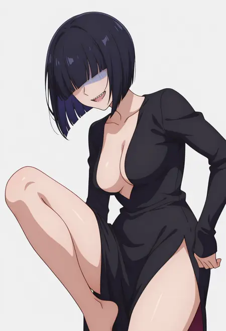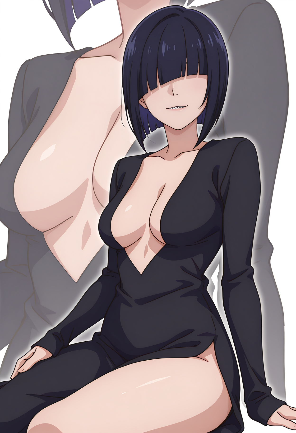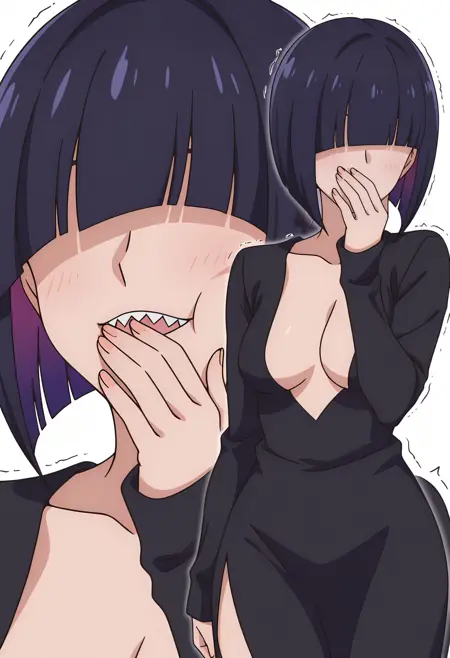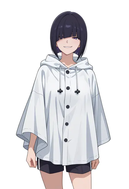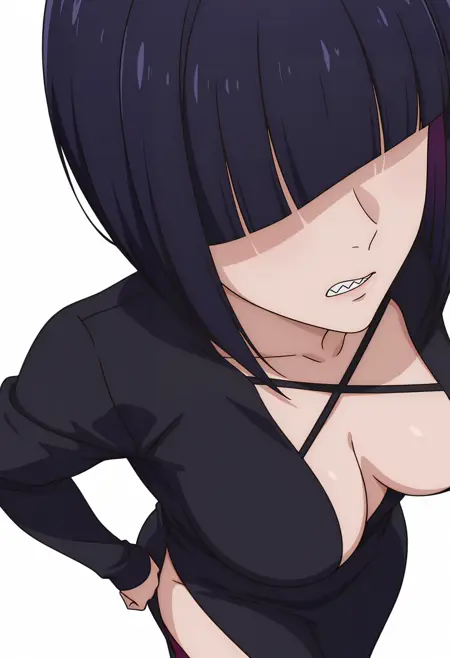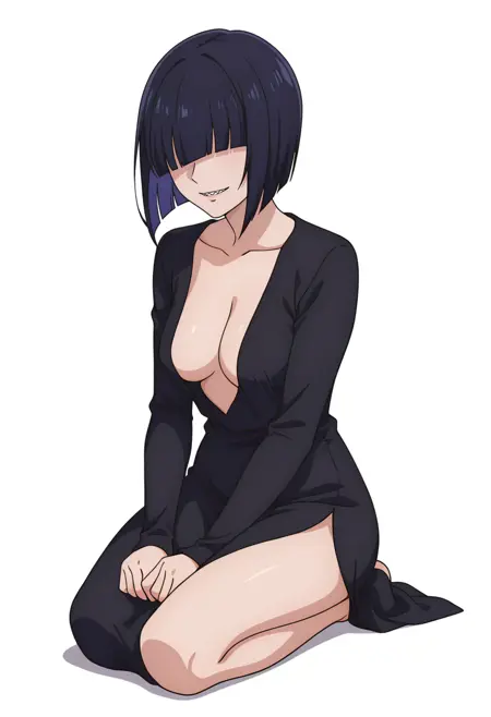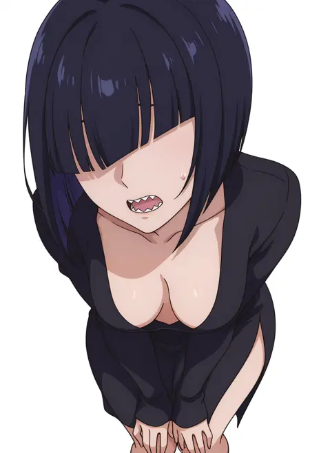 girikocnn, 1girl,短发,鲍勃头,头发遮住眼睛,齐刘海,整齐发尾,尖牙,