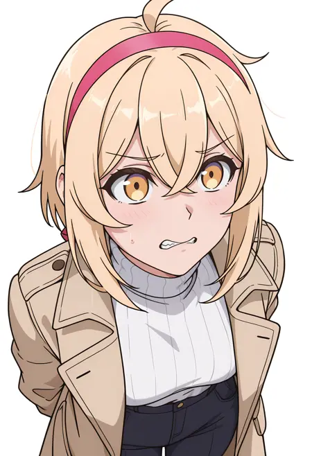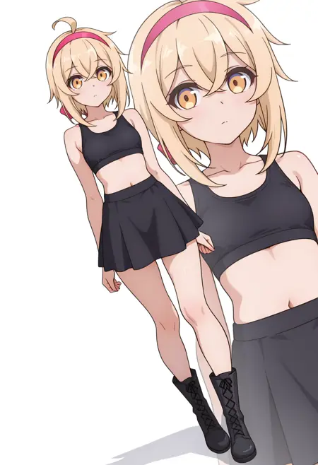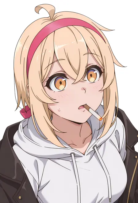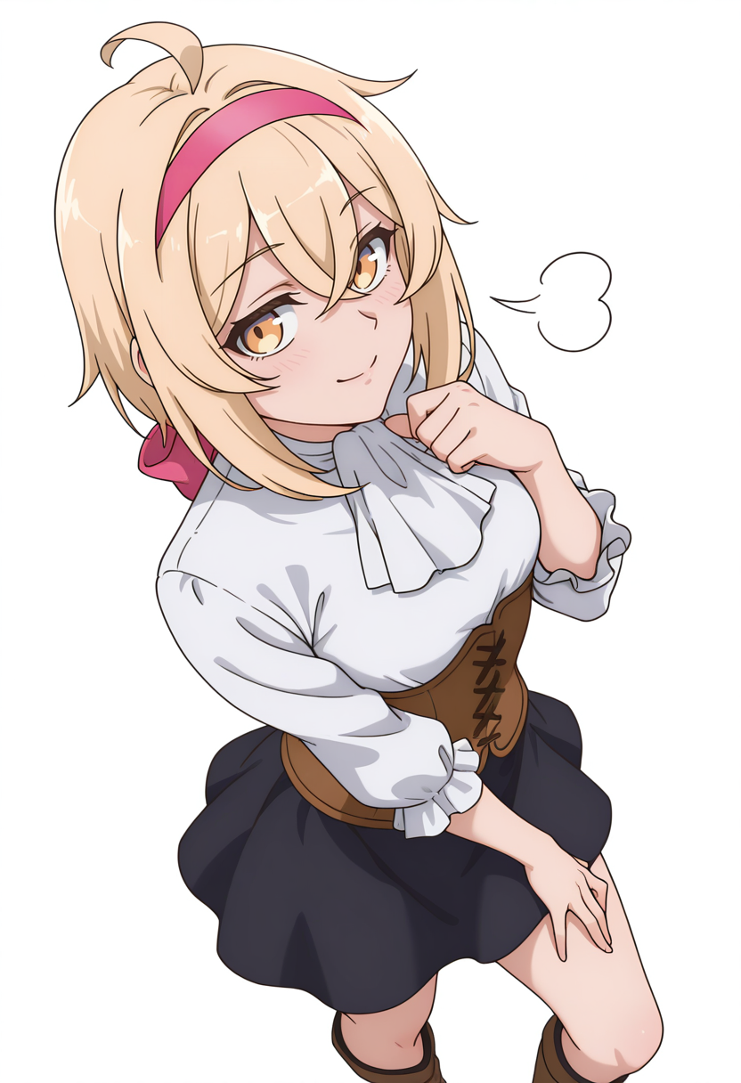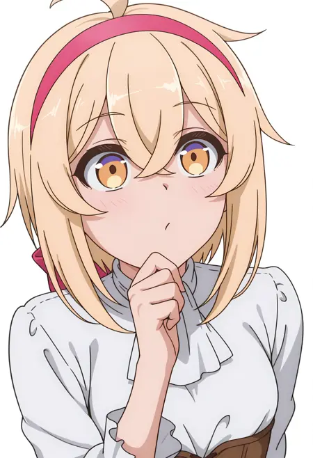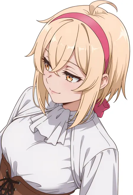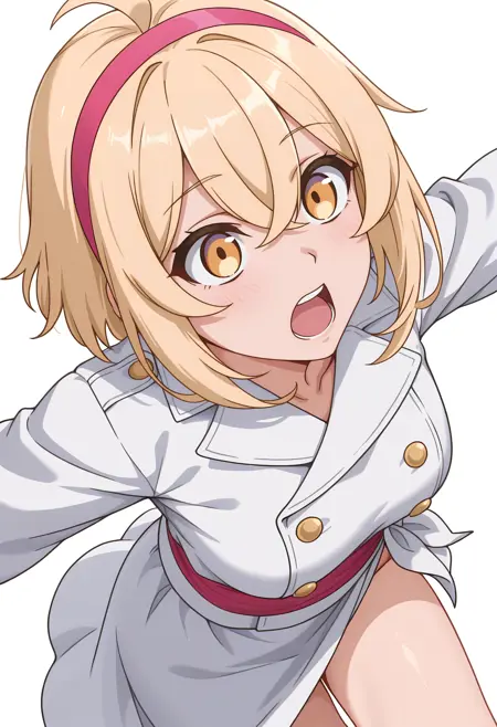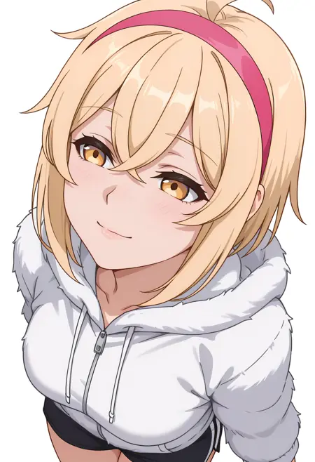 alyssacnn,1girl, blonde hair, pink hairband, short hair, yellow eyes, hair between eyes, ahoge,