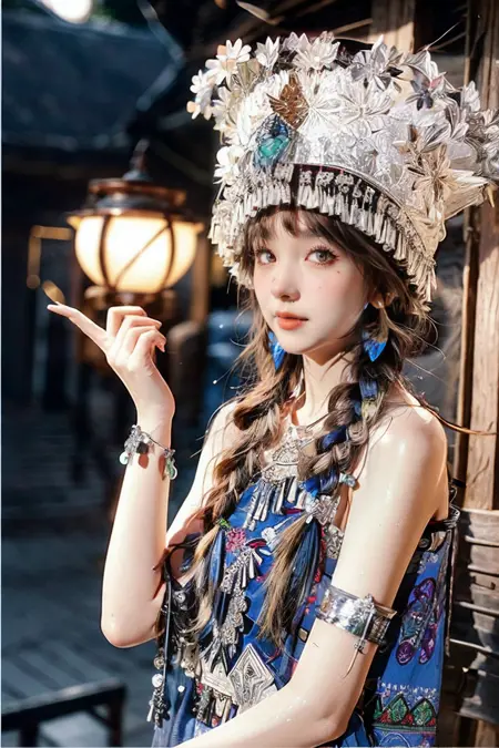 ポジティブプロンプト:braid, 1girl, blurry, twin_braids, blurry_background, solo, jewelry, depth_of_field, sitting, bracelet, hat, brown_eyes, looking_at_viewer, (Ultra-realistic 8k CG: 1.2), perfect artwork, exquisite patterns, intricate details, (unparalleled masterpiece, best quality: 1.2), (extremely complex: 1.2),