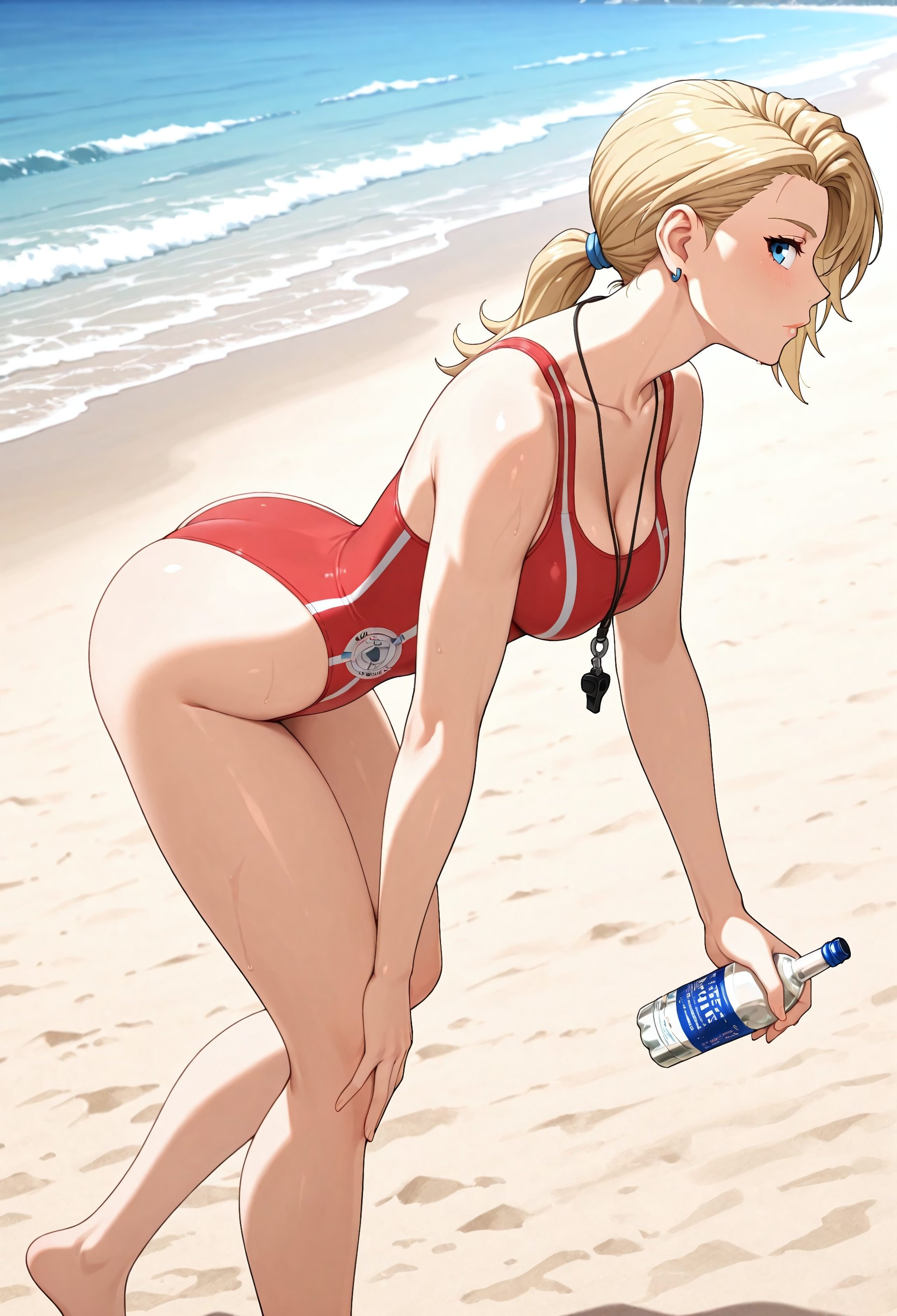 earring, lifeguard, swimsuit, red one-piece swimsuit, highleg swimsuit, whistle around neck, barefoot