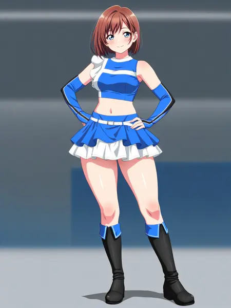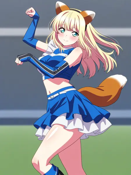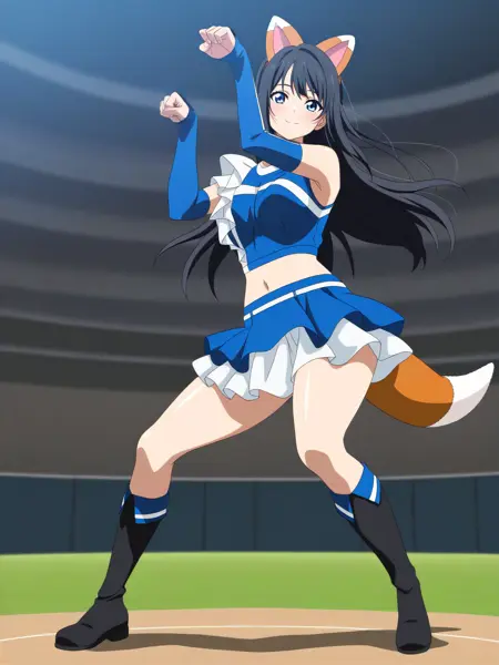 啦啦队队员,爪子姿势,fightersgirl,蓝色上衣,露脐装,双色上衣,荷叶边袖子,露肩,可拆卸袖子,蓝色短裙,层叠裙,迷你裙,荷叶边裙,肚脐,蓝色手套,肘部手套,露指手套,黑色靴子,假动物耳朵,狐狸耳朵,假尾巴,狐狸尾巴