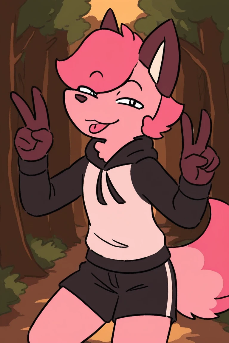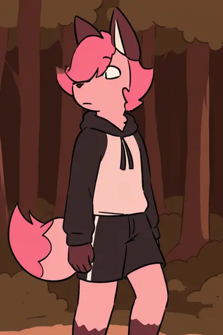 prompt : kitsune, pink hair, light pink fur, hoodie, shorts, smug, :3, 1boy, full body, forest background, high quality, masterpiece, highest quality