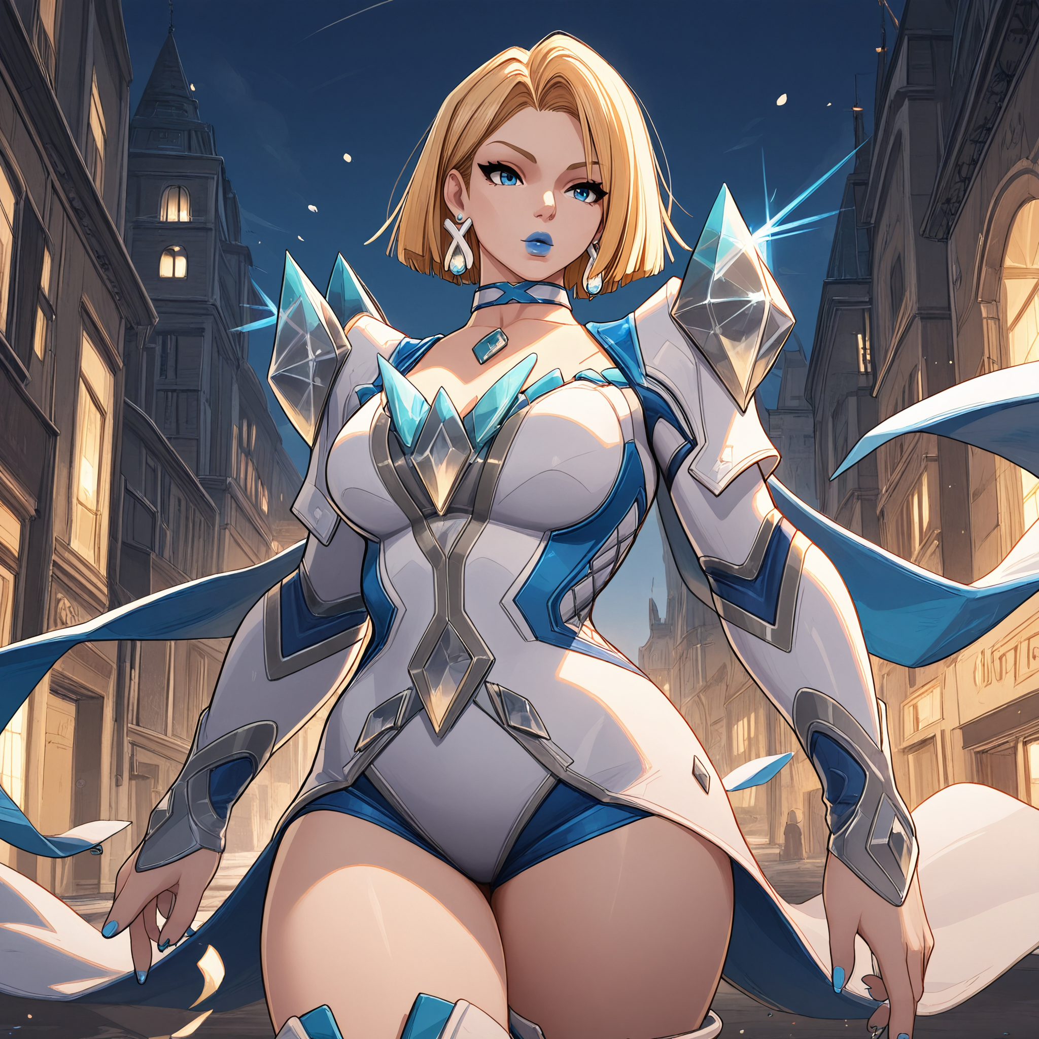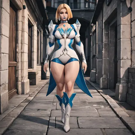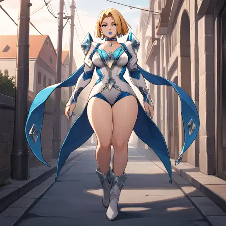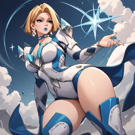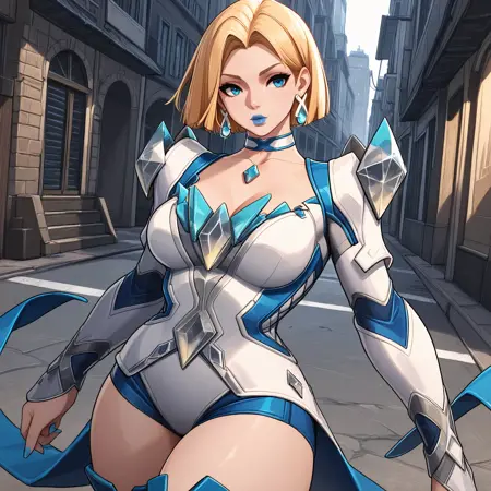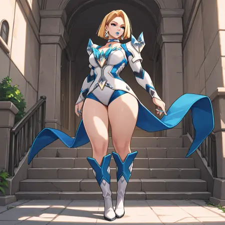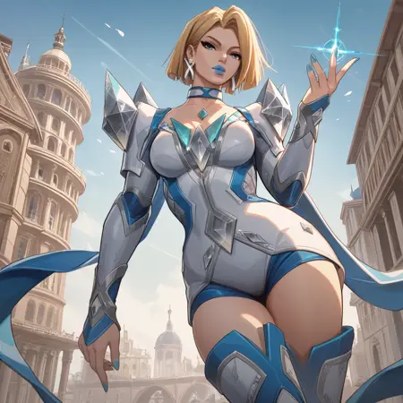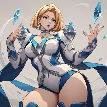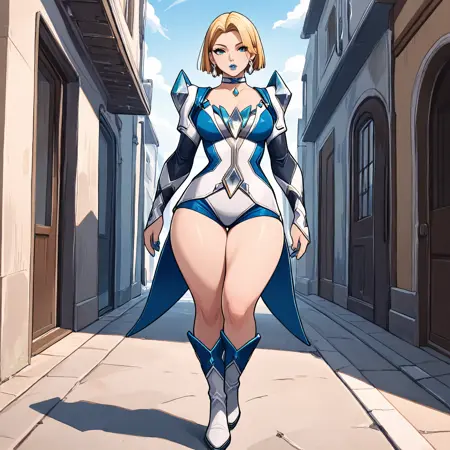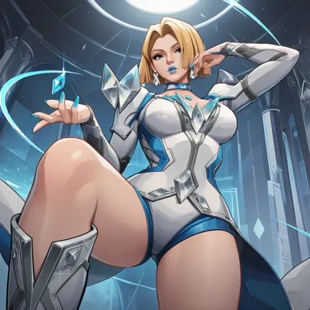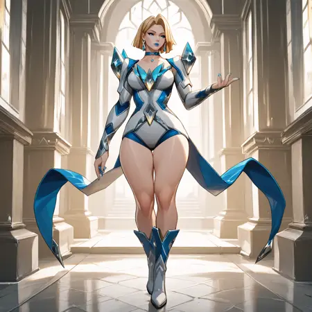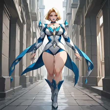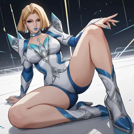 1girl, solo, choker, thighs, efr0st, white outfit, blue outfit, blonde, bodysuit, earring, blonde hair, short hair, lipstick, jewelry, earrings, blue lips, blue nails, boots, shoulder armor, thick thighs, boots, bare thigh