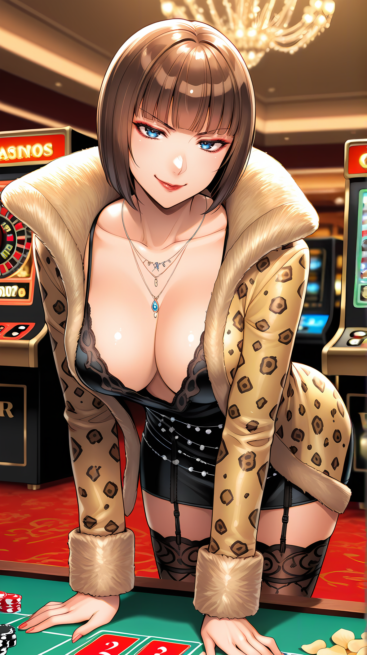 tkkannadress, blue eyes, brown hair, short hair, bob cut, blunt bangs, red lips, makeup, jewelry, necklace, fur-trimmed coat, leopard print, plunging neckline, black dress, florap print, lace, short dress, garter straps, black thighhighs, print thighhighs, black high heels,