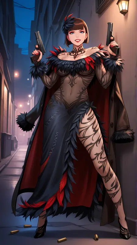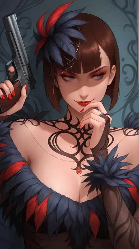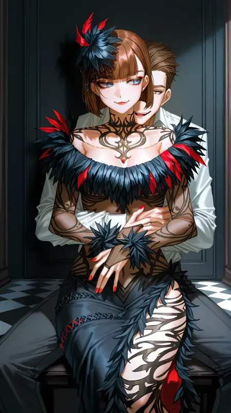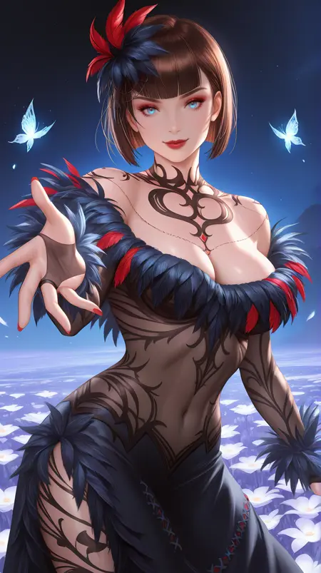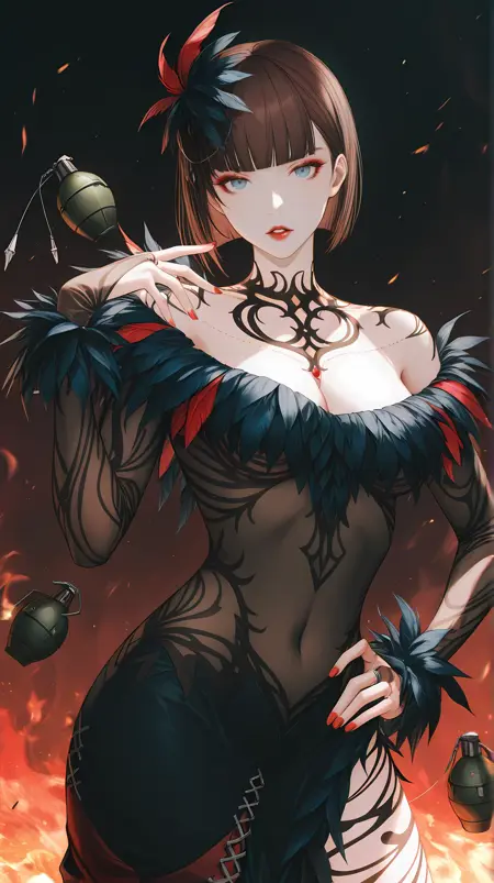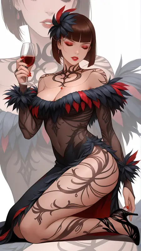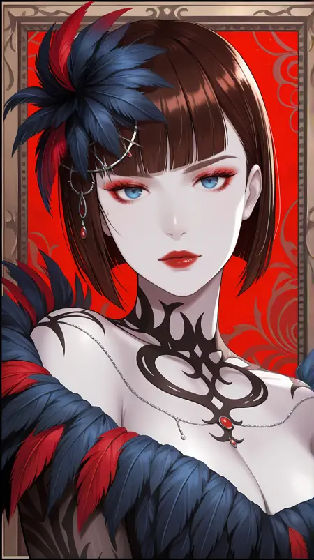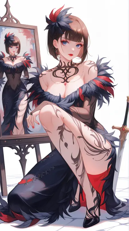 | 训练词汇 | tkkanna7, blue eyes, brown hair, short hair, bob cut, blunt bangs, jewelry, hair ornament, necklace, red lips, makeup, nail polish, red nails, feather-trimmed dress, two-tone dress, black dress, red dress, see-through dress, see-through sleeves, long sleeves, revealing clothes, bridal gauntlets, side slit, black high heels,已复制! |
