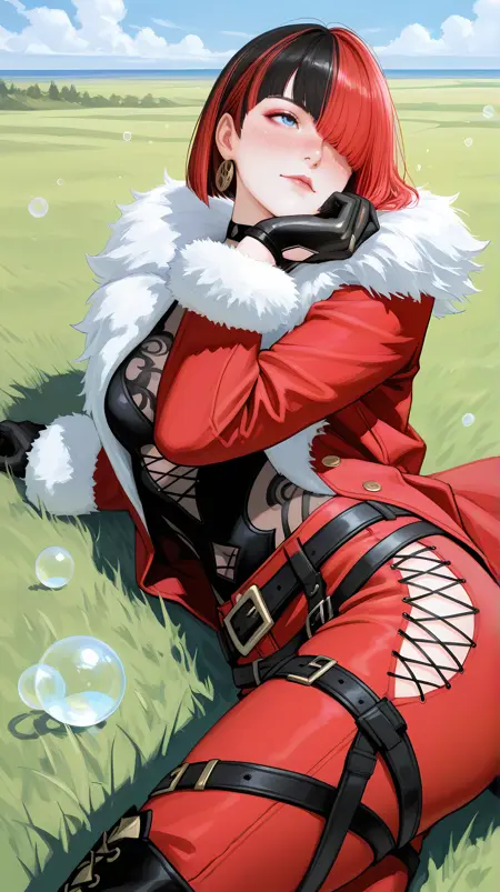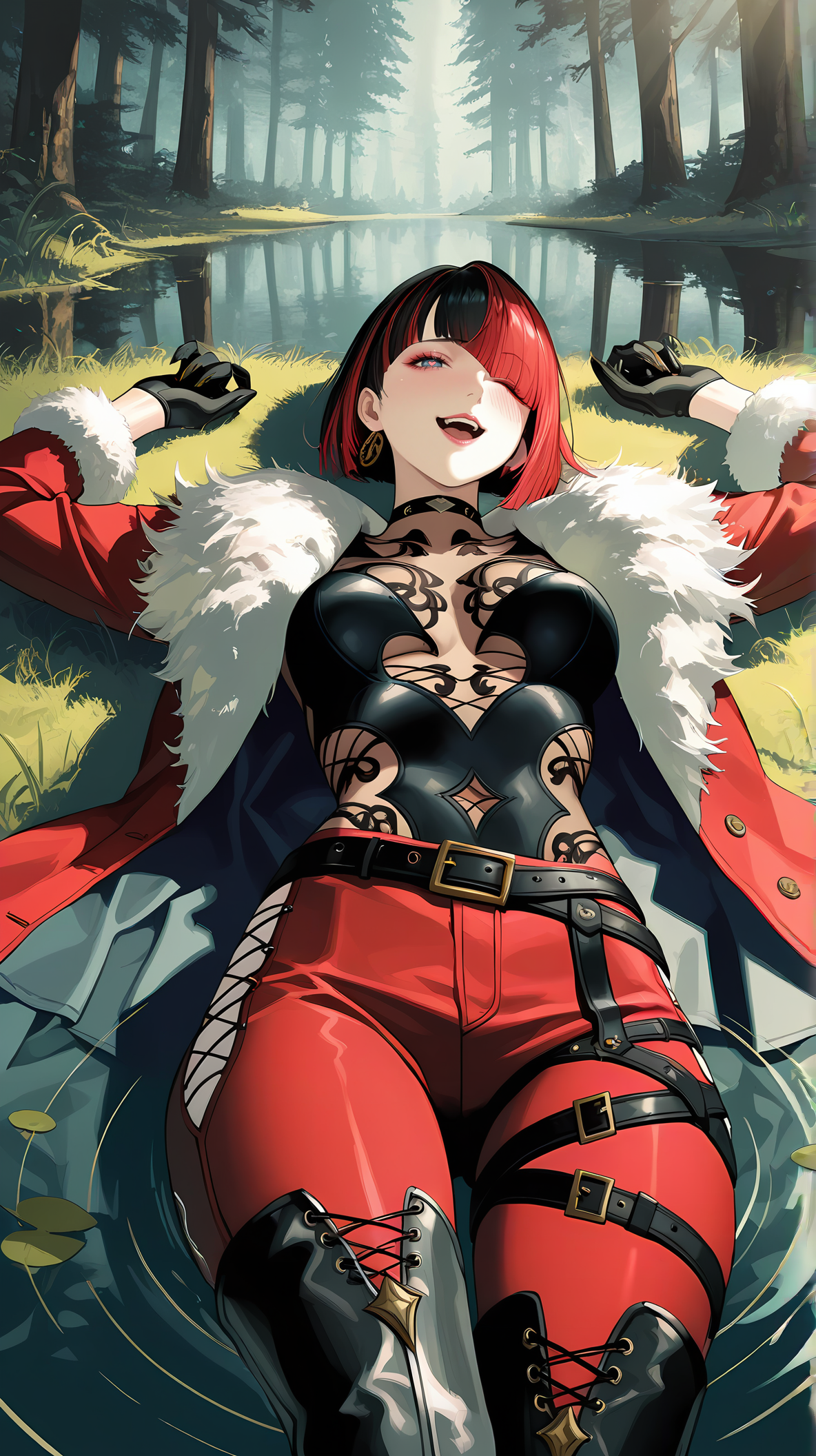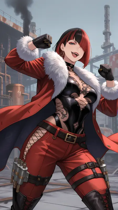 tkkanna8, blue eyes, two-tone hair, black hair, red hair, short hair, hair over one eye, bob cut, fur-trimmed coat, red coat, black choker, single earring, jewelry, makeup, lipstick, black crop top, cross-laced top, long sleeves, innerboob, clothing cutout, lace, revealing clothes, black gloves, claws, black belt, multiple belts, thigh straps, red pants, cross-laced legwear, hip vent, black thigh boots,