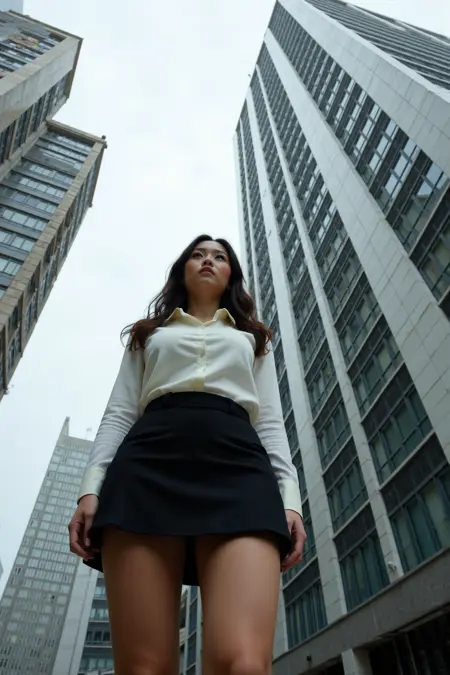 트리거 f3mLowAngle를 사용하고 원하는 옷차림 유형/스타일을 명시하세요.