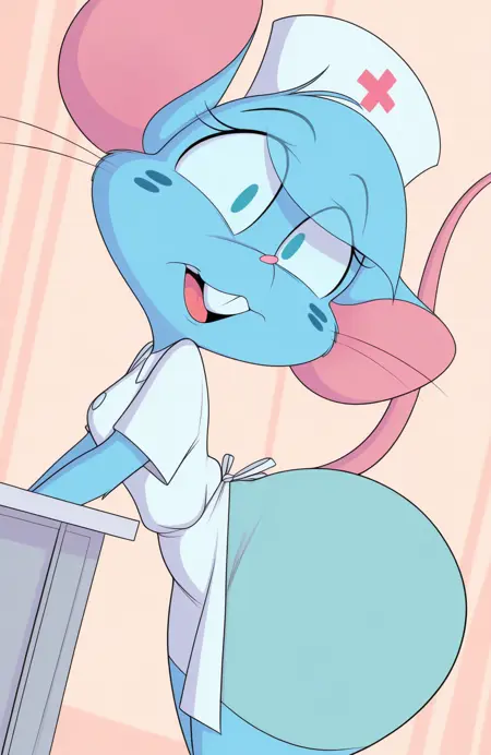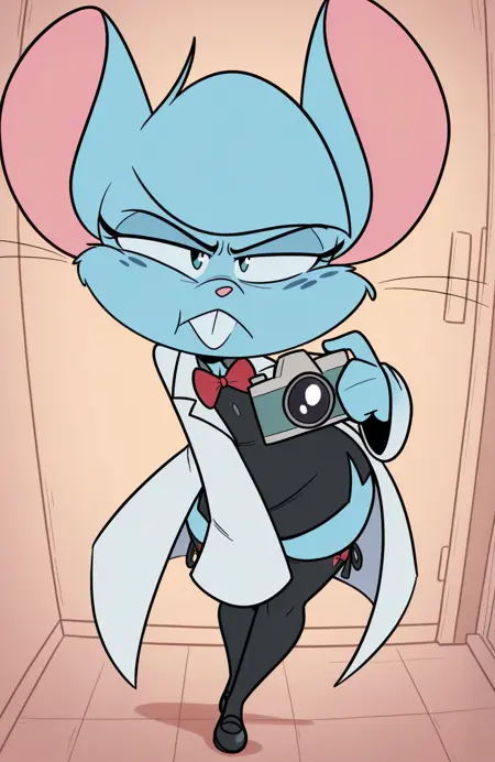 mia mousette, pink nose, buck teeth, eyes visible through hair, blue eyes, blue fur, wide hips