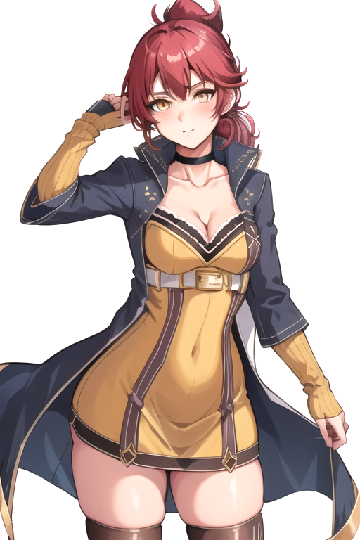 SaraValestein, 1girl, solo, thighhighs, yellow dress, cleavage, medium breasts, yellow eyes, red hair, choker, folded ponytail, blue coat