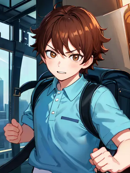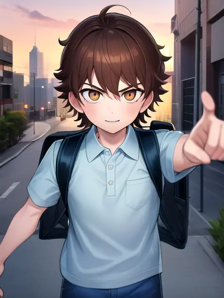 可能有帮助的附加词:棕色头发、棕色眼睛、蓝色衬衫、男童、背包