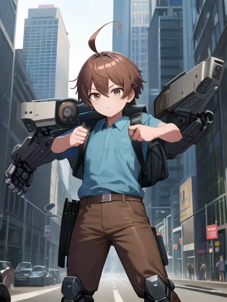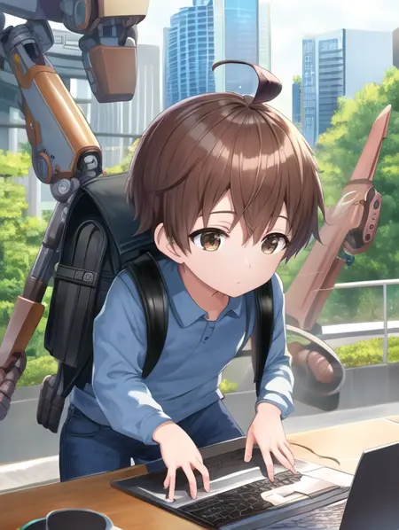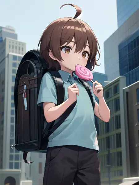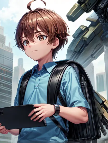 Additional words that may help: brown hair, brown eyes, blue shirt, male child, backpack,
