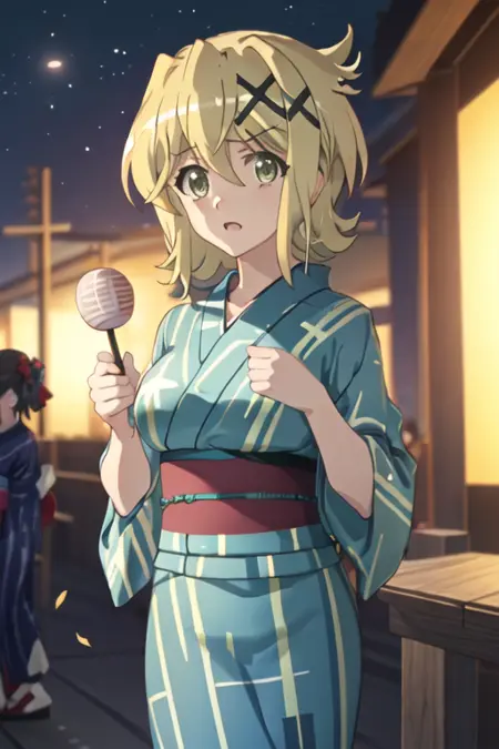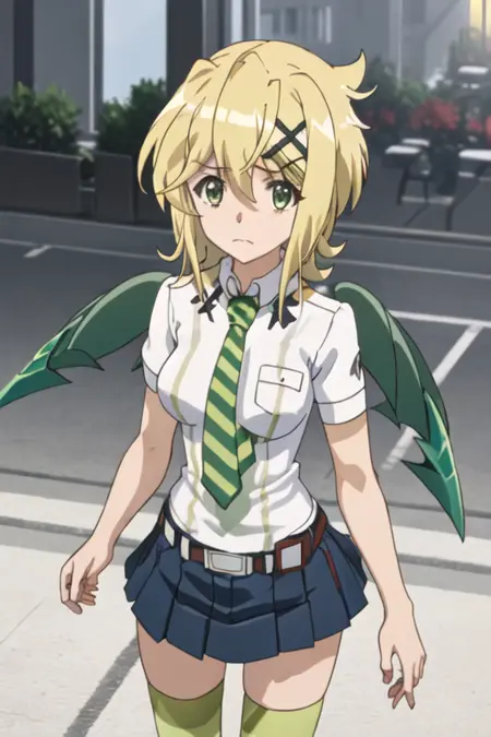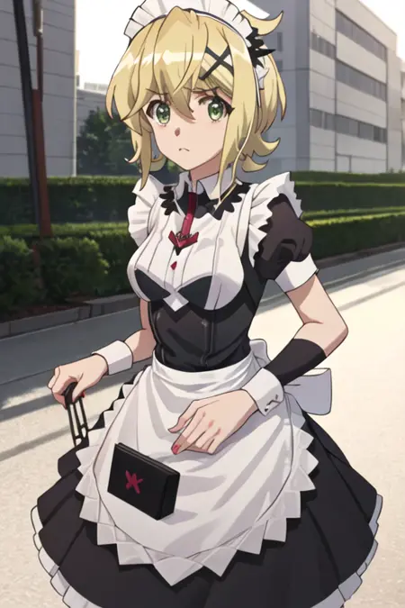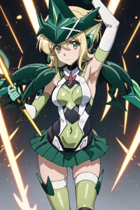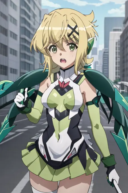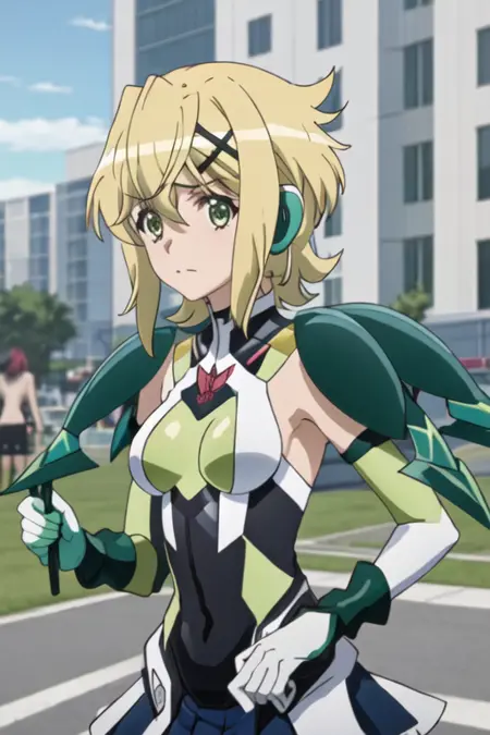 The trigger word is akatsuki_kirika_senkizesshousymphogear, and the recommended tags are best quality, masterpiece, highres, solo, {akatsuki_kirika_senkizesshousymphogear:1.15}, blonde_hair, short_hair, green_eyes, shiny_hair, hair_ornament, shiny, x_hair_ornament, breasts, medium_breasts, hair_between_eyes.
