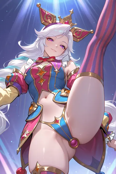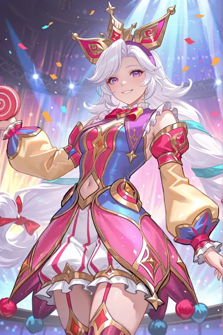 🧠 Trigger Words (Starlight):cicistarlight, 1girl, very long hair, white hair, twin braids, bangs, purple eyes, bare shoulder, crown hairband, jester costume, detached sleeves, puffy sleeves, navel cutout, striped thighhighs, white high heels