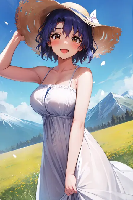 Character trigger : fuka toyokawa, blue hair, short hair, wavy hair, antenna hair, brown eyes, large breasts