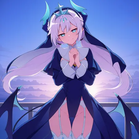 외모: 파란 눈, +_+, 두꺼운 eyebrows, 흰 머리, 낮은 트위테일, 티아라, 악마 뿔, 중앙으로 갈라진 앞머리, 머리 끝이 들려 있음, 뾰족한 귀, 작은 가슴, 꼬리, 땋은 머리 루프, 엉덩이 악마 날개
