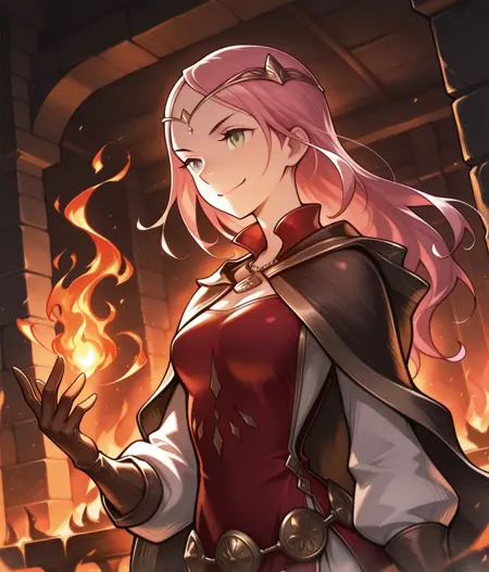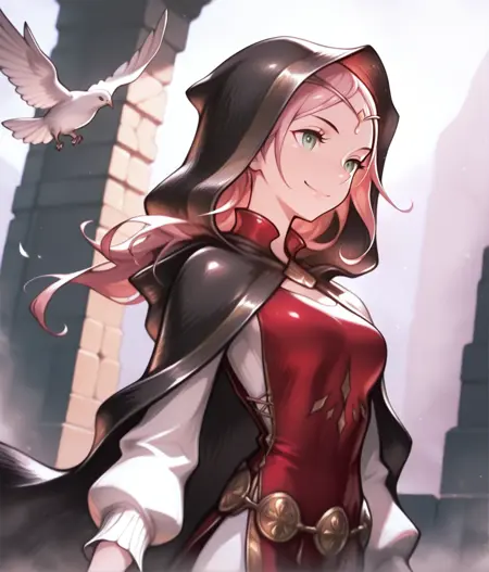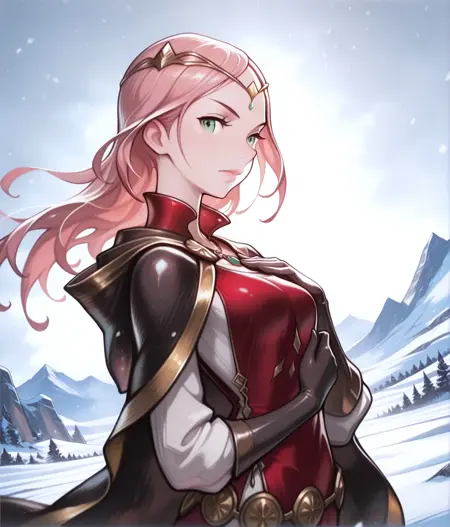 衣装: 赤いドレス、白いドレス、ロングドレス、イヤリング、ジュエリー、黒いマント、長袖、黒い肘まで行く手袋、ティアラ、ディアデム、サーキェル、ベルト