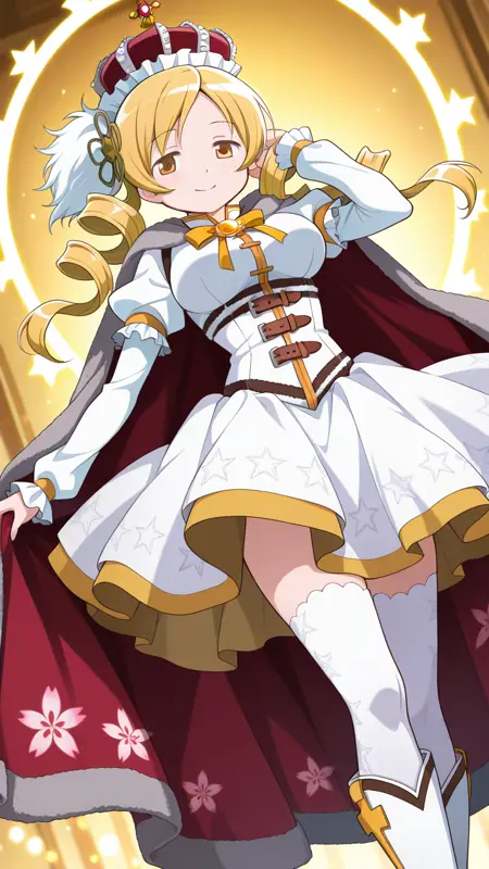 holy mami, magical girl, red crown, floral print, forehead, forehead jewel, halo behind head, frilled headwear, frilled sleeves, frills, white dress, juliet sleeves, long sleeves, grey cape, red cape, two-sided cape, star (symbol), short dress, fur-trimmed cape, yellow gemstone, white thighhighs, white boots,