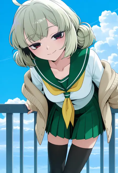- Araga Kiwi, 눈 밑 점, 아호게, 치마, 검은 허벅지양말, 주름치마, 녹색 해군 칼라, 교복, 갈색 카디건, 벌어진 카디건, 흰 셔츠, 녹색 치마, 어깨 드러냄, 노란 넥커치프,