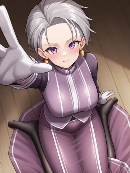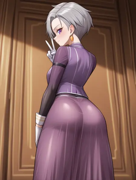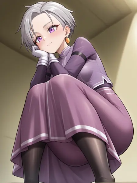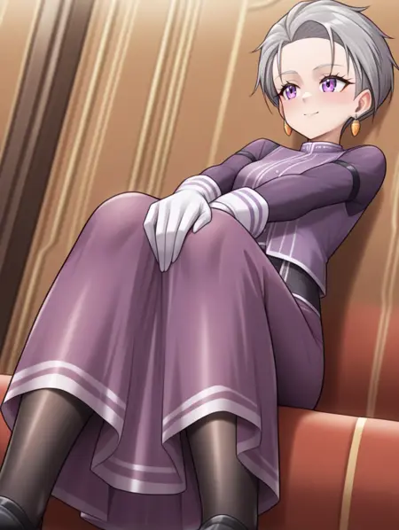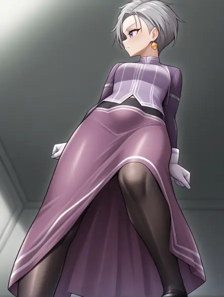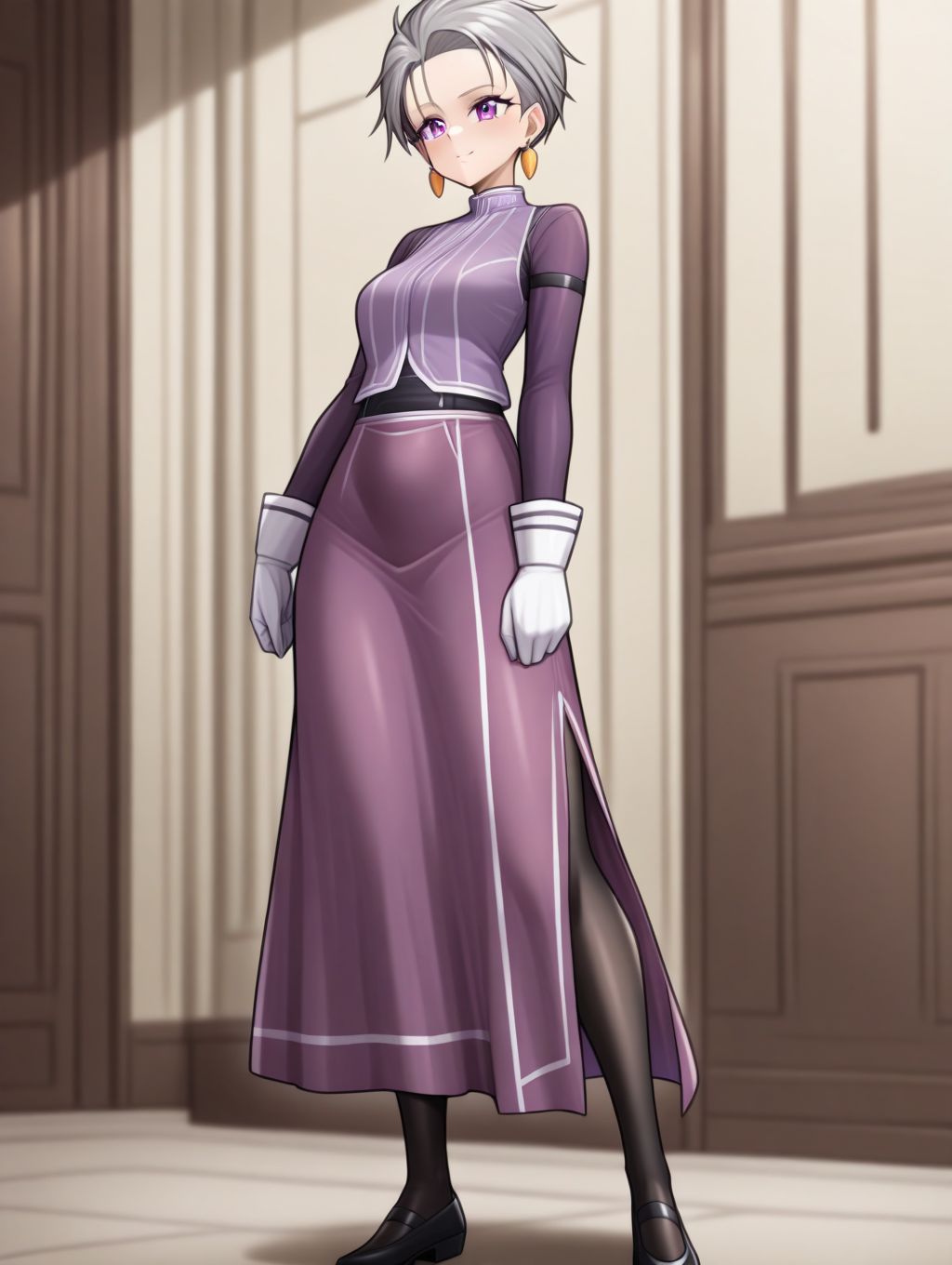prompt example :burea,grey hair,short hair,black legwear,white line,tight long skirt,purple shirt,earrings,full body,purple eyes,purple skirt,white gloves,