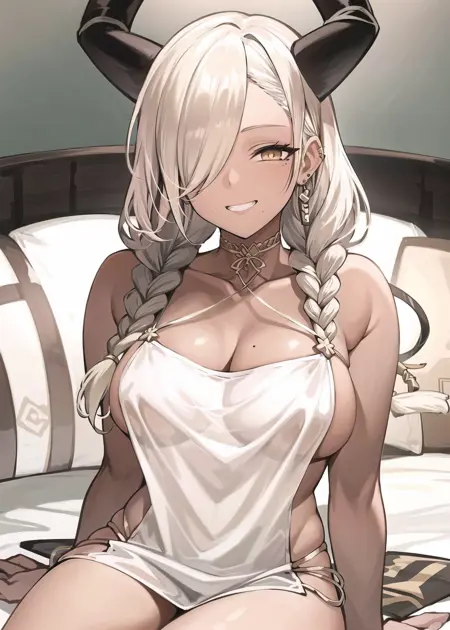 새 스킨 이름이 뭐였더라(shimmering forsythia): owari(azur_lane), 뿔, 검은피부 여자, 쌍꼬리 땋기, 한 눈을 가린 머리, 귀걸이, 입 아래 점, 흰 드레스, 보석,