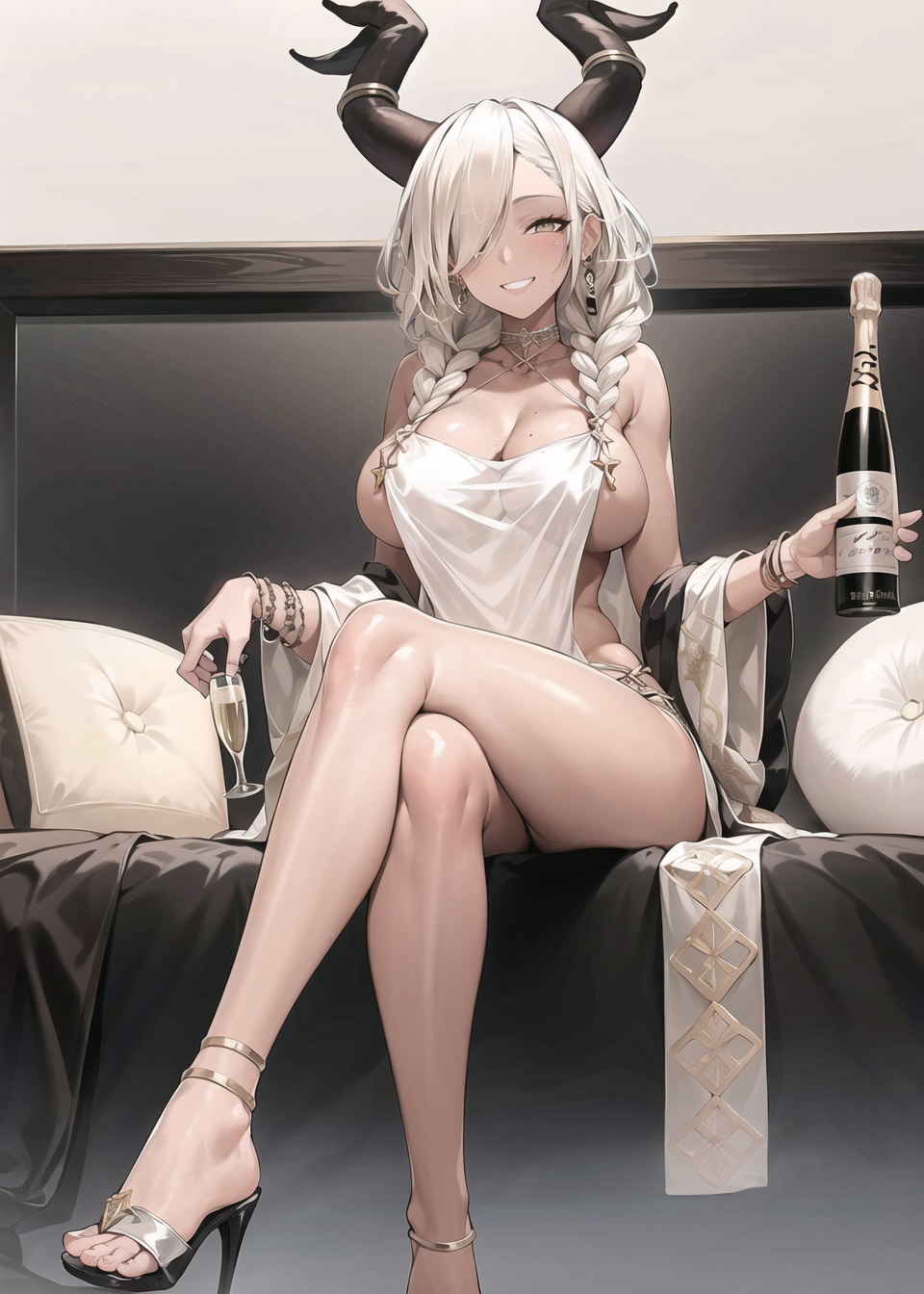 新皮肤叫啥来着(shimmering forsythia): owari\(azur_lane\), 角, 深色皮肤女性, 双辫子, 头发遮住一只眼睛, 耳环, 嘴下有痣, 白色连衣裙, 珠宝,