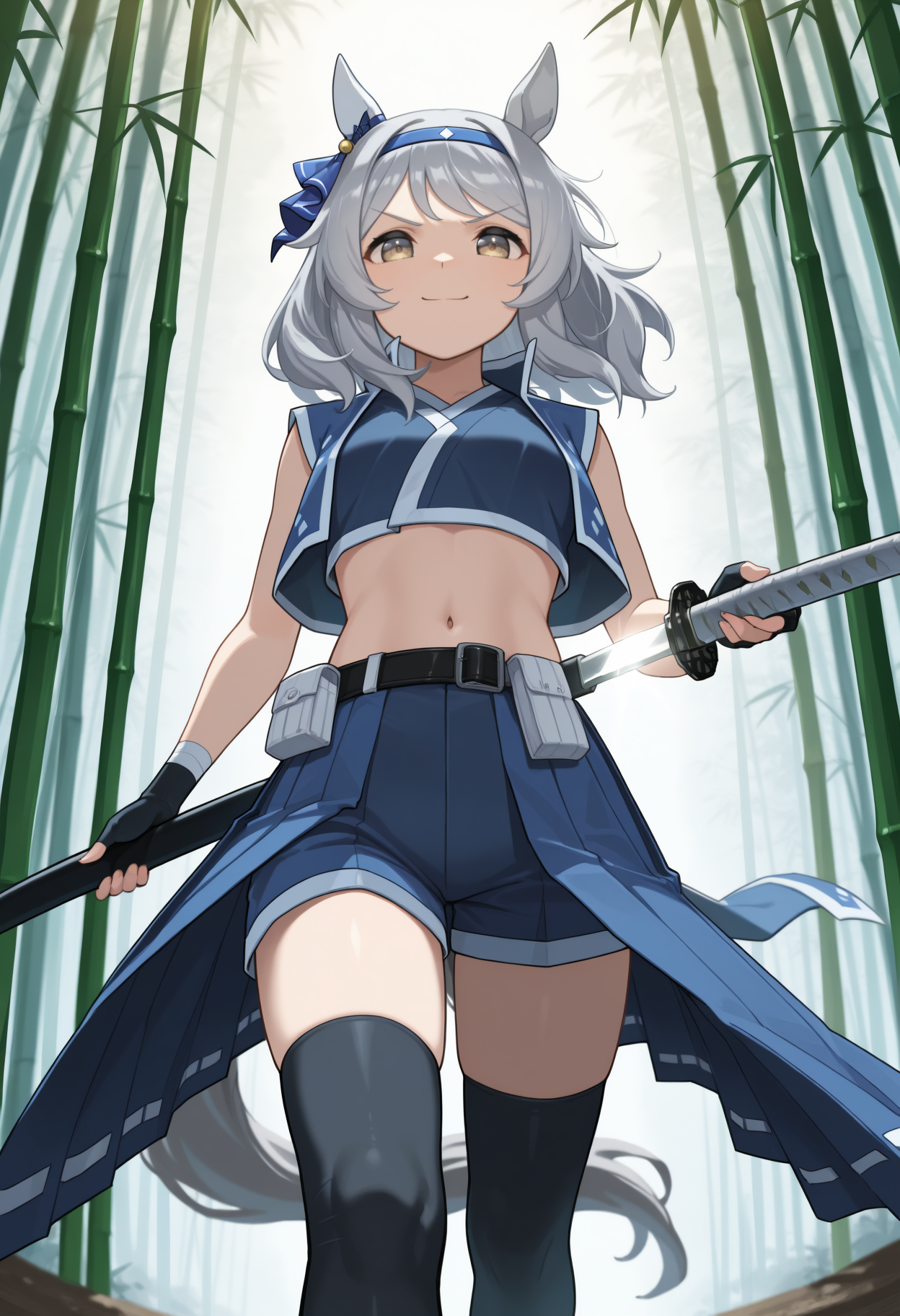 施展奇迹: hsmrclnnj, 马尾, 灰色头发, 蓝色发带, 动物耳朵, 耳部丝带, 蓝色丝带, 棕色眼睛, 蓝色背心, 短款背心, 开襟背心, 蓝色和服, 短款和服, 黑色手套, 露指手套, 蓝色裙子, 百褶裙, 外裙, 黑色腰带, 腰带包, 蓝色短裤, 短款短裤, 黑色过膝袜, 腹部, 脐部