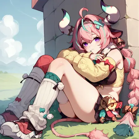 ピンクの髪、長い髪、ストライプ入りの髪、ツインバッジ、牛の耳、牛の角、耳の鈴、紫の目、x ヘアオーナメント、尾のリボン、