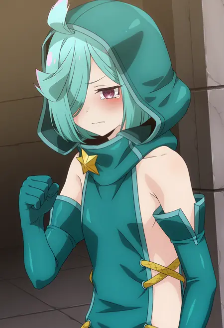 - Anemo Nemo, 장갑, 허벅지 부츠, 청록색 머리카락, 노출된 투피스, 후드, 팔꿈치 장갑,