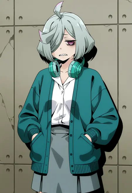 - Anemo Nemo, 카디건, 흰색 셔츠, 열린 옷차림, 회색 치마, 눈밑의 다크 서클, 아호게, 날카로운 이빨, 목에 걸린 헤드폰,