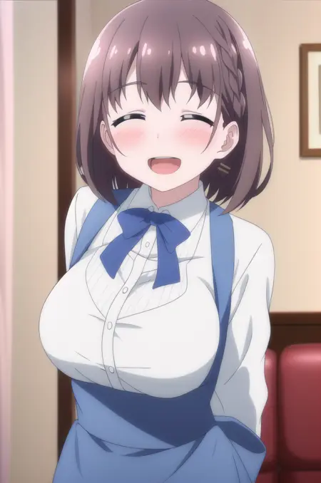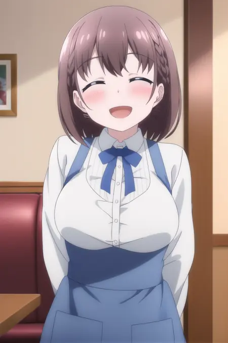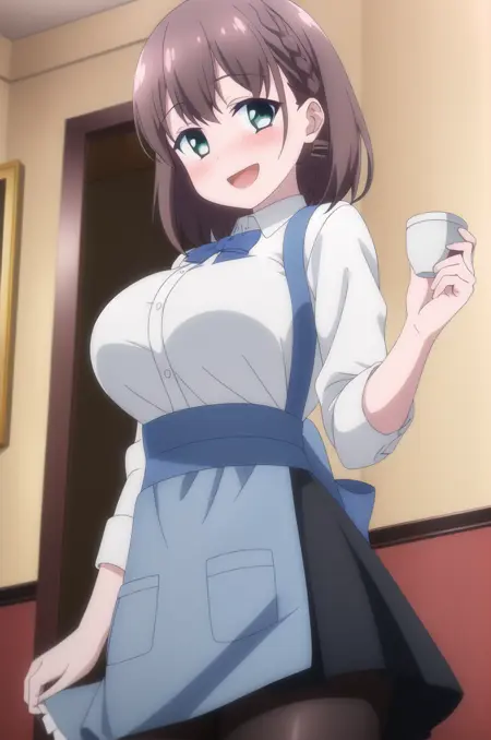 outfit_2, waitress, blue apron, white collared shirt, blue bow, sleeves rolled up, black pants, black shoes,