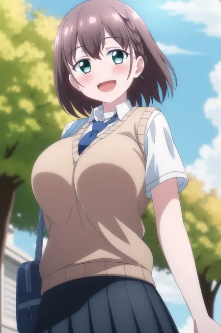 <lora:Commission_Ai-v1-06:0.7>, ChopioAi, brown hair, short hair, side braid, hairclip, green eyes, (looking at viewer:1.3),
