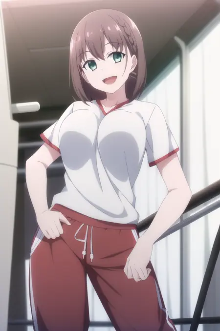 outfit_3, gym uniform, gym shirt, white shirt, red pants, track pants, white sneakers,