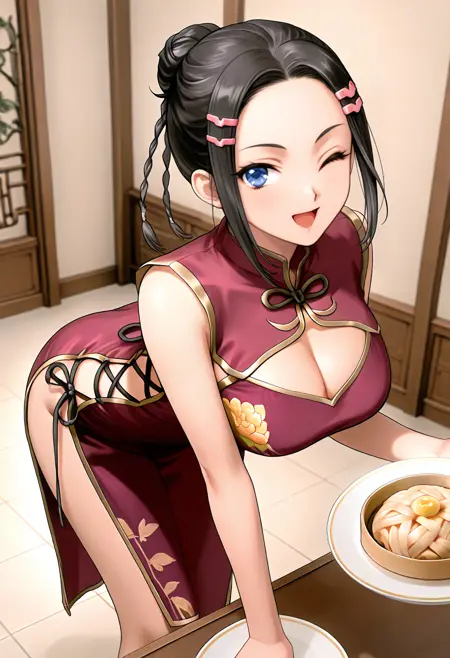 blue Chinese dress, blue colored bike shorts, black wristbands, large breasts, black hair, short hair, no bangs, hair bun, sidelocks, hair ornament, twin braids, blue eyes