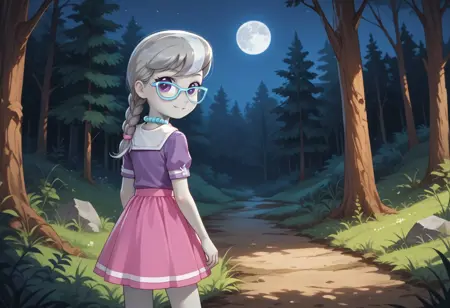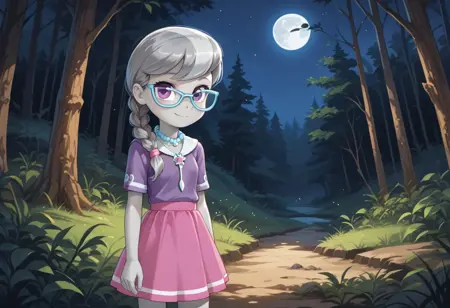 Silver Spoon, human, young girl, silver skin, purple eyes, She has blue glasses with thin frames, a purple blouse with short sleeves and a white collar, a necklace, a pink skirt, and purple boots with blue bows, silver hair, styled in a braid, tied with a pink elastic band. Part of the hair is neatly combed over the forehead,