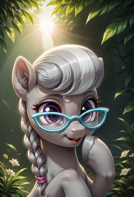 Silver Spoon,小马,浅灰色身体,紫色眼睛,蓝色细框眼镜,角色有一条长辫子,一条珍珠项链,大地小马,